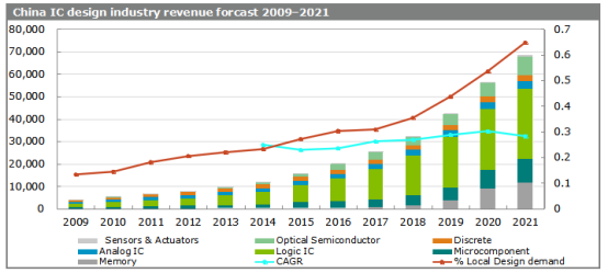 • The 2015–20 CAGR target of China’s IC design industry will be around 30%, which is higher than the whole semiconductor industry’s 20% growth rate target that was specified in the government guideline file.