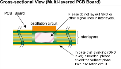 -In case of multi-layered PCB board, do not lay out other signal lines under crystal unit.