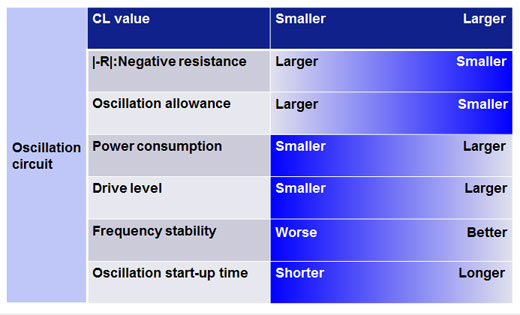 For instance, crystal with small CL(7.0 pF) makes larger oscillation allowance, smaller current consumption and worse frequency stability, like below table.